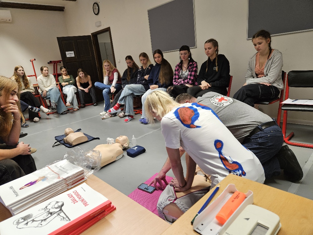 Studenti 7. a 8. ročníku si vyzkoušeli, jaké to je být záchranářem. Pod vedením zkušeného lektora Českého červeného kříže absolvovali praktický kurz první pomoci. Naučili se rozpoznat život ohrožující stavy, správně volat záchrannou službu i poskytnout pomoc při úrazech a bezvědomí. Nechyběly modelové situace ani trénink resuscitace na figurínách.